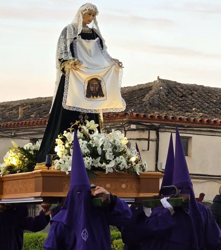 Figura central de la Procesión Temprana, la Verónica realiza un recorrido propio y se encuentra tres veces con Jesús Nazareno, representando sus caídas en el camino al Calvario. En cada encuentro, eleva el paño y limpia el rostro del Señor, descubriéndose la cara de Jesús y preservando este gesto tradicional de consuelo y reverencia.