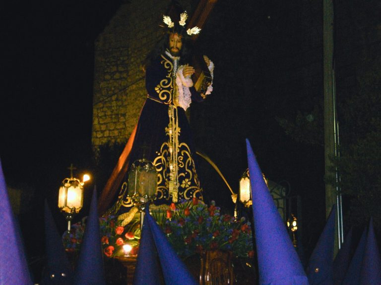 Nuestra Cofradía desfila con la sobriedad que exige el momento. A la cabeza, el Estandarte, escoltado por dos faroles, abre el camino a las imágenes de Jesús de Medinaceli, Jesús Nazareno, San Juan y la Virgen Dolorosa que cierra el cortejo. En el silencio absoluto, nuestra presencia es una declaración pública de fe y un acto de acompañamiento al inicio de la Pasión.