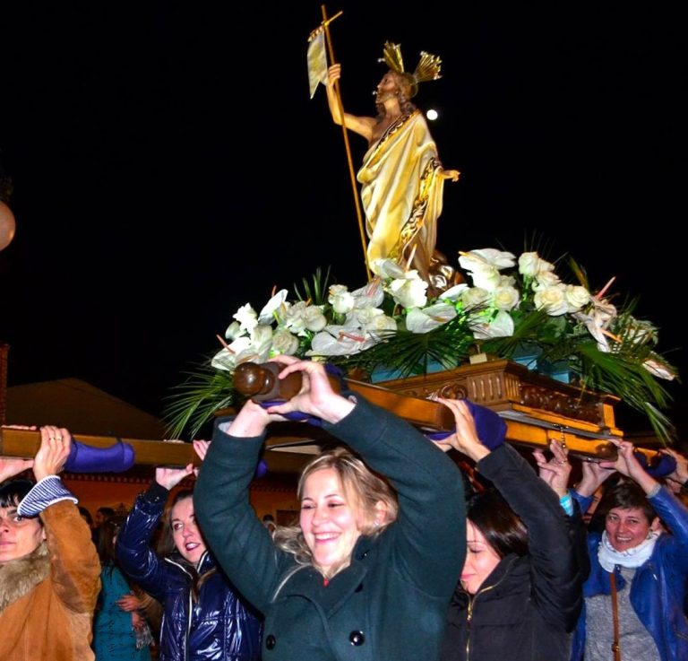 Tras la Vigilia Pascual, la imagen sale por la puerta norte de la parroquia hasta su plaza principal, donde la Virgen del Rosario, cubierta por un velo negro, espera a que llegue su Hijo.